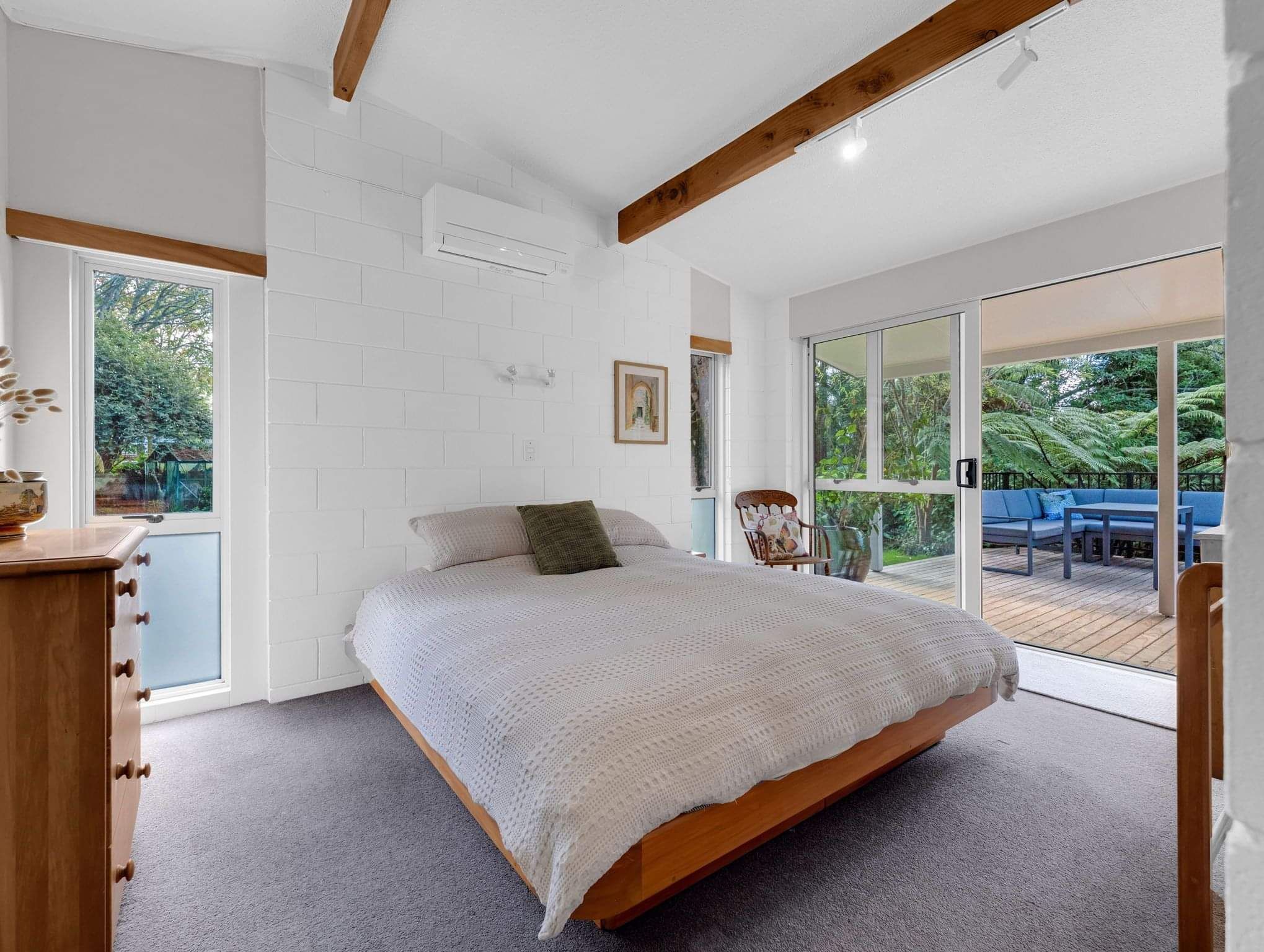 Inside, you’ll find a modern kitchen and beautifully updated bathrooms, along with double glazing throughout for year-round comfort. Three heat pumps ensure the home stays warm in winter and cool in summer, while the sunny living areas create a welcoming and relaxed atmosphere.